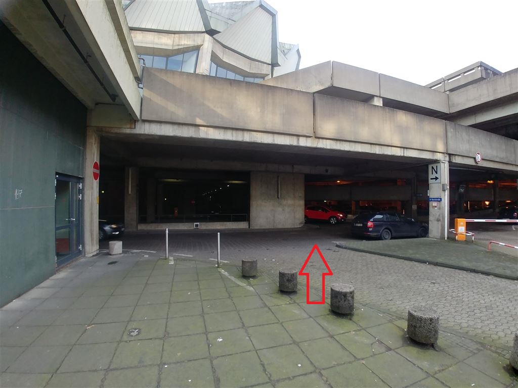 Verlassen Sie das Gebäude NA auf der Etage 03 im Norden und gehen Sie nach links um das Parkhaus zu durchqueren.